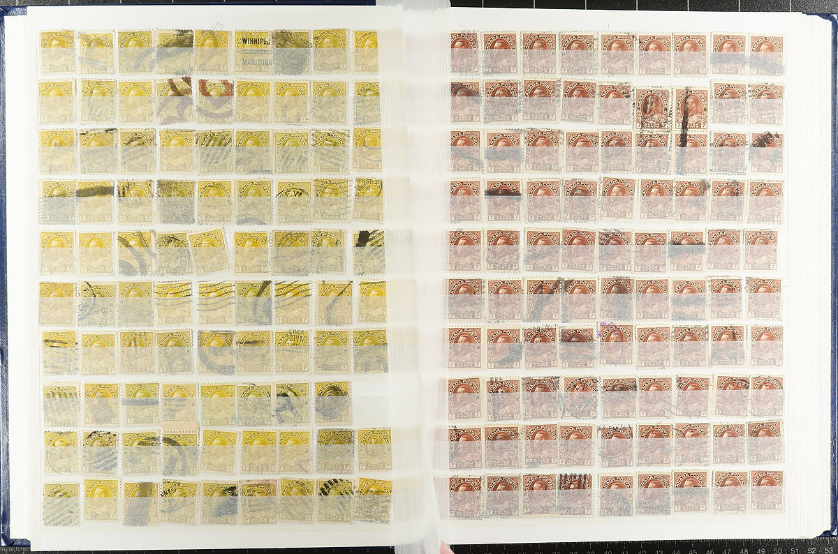 Used Admiral Holding. A collector's holding of over 1500 used Admiral stamps, from 1c to $1.00 plus a few coils. Seemingly added as acquired by the collector, so likely unchecked for any varieties, and we noted the odd better postmark / perfin / precancel etc. All house in a like-new 64-page Unisafe stockbook, worth a pretty penny alone. Estimate =