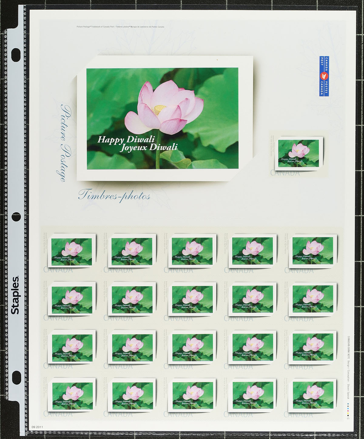 VF mint Post Office Fresh set of 2011 Diwali (set of two), 2011 EID (set of two), 2011 Hanukkah (set of two) and 2011 Winnipeg Jets (two of the three issued) Picture Postage panes of 21. The panes of PP1-PP6 are the Type 3 printings, PP8-PP9 are Type 4 printings, all dated "09 2011". These were only available in full panes directly from the Canadian Bank Note Company or Canada Post. Scarce modern material, overlooked by most collectors when issued. Undervalued in the catalogue (in our opinion). 2024 Unitrade =