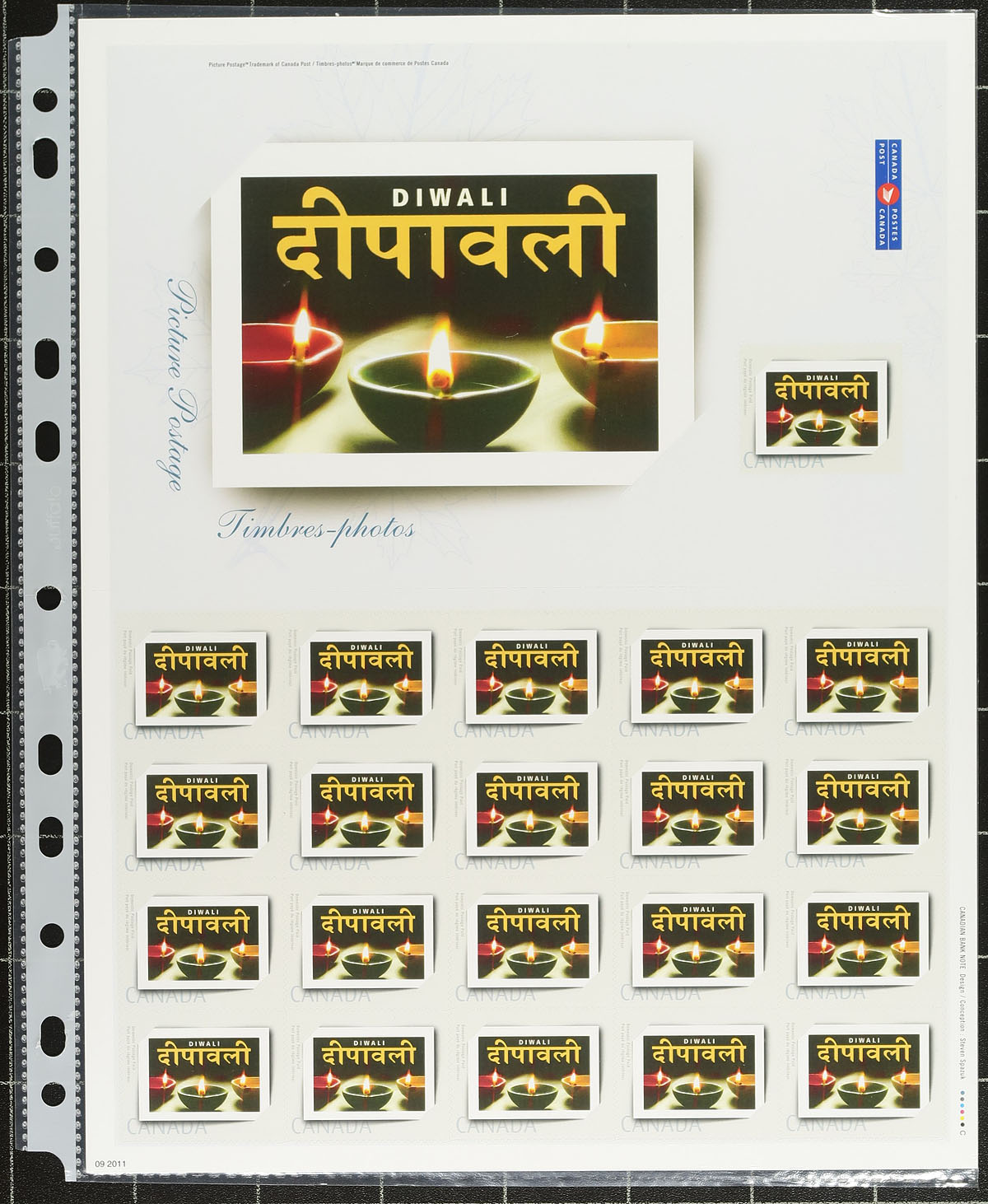 VF mint Post Office Fresh set of 2011 Diwali (set of two), 2011 EID (set of two), 2011 Hanukkah (set of two) and 2011 Winnipeg Jets (two of the three issued) Picture Postage panes of 21. The panes of PP1-PP6 are the Type 3 printings, PP8-PP9 are Type 4 printings, all dated "09 2011". These were only available in full panes directly from the Canadian Bank Note Company or Canada Post. Scarce modern material, overlooked by most collectors when issued. Undervalued in the catalogue (in our opinion). 2024 Unitrade =