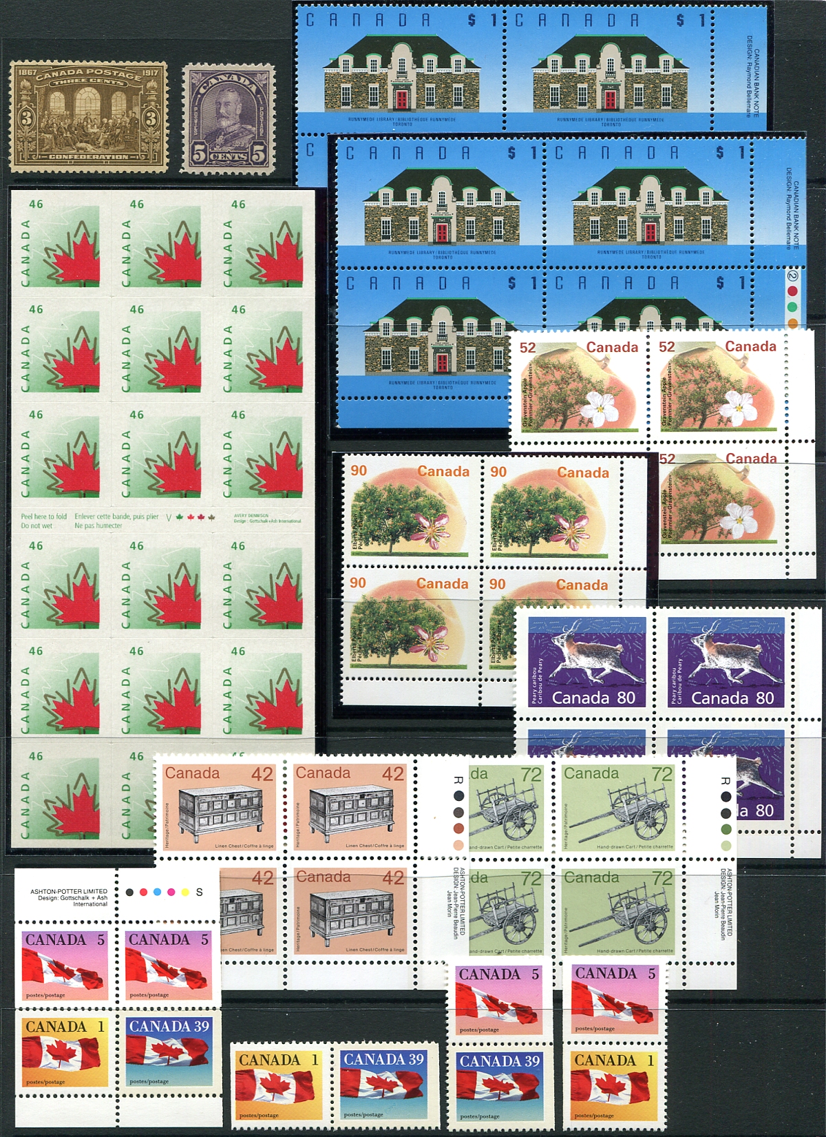 Eclectic and valuable "odds and ends" 1917-2004 period mint balance of consignment from a very advanced and fussy Canadian specialist. The bulk of the value is in the more modern better definitive plate blocks and booklets. See the scans for the complete inventory list with Unitrade numbers, stamp descriptions and catalogue values. 2024 Unitrade =