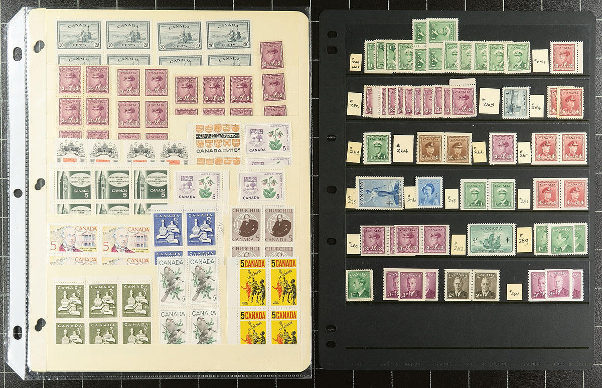 Mint Mish Mash. An intriguing and valuable holding of primarily QEII material (but noticed the odd earlier item). Arranged on 23 stockages, with emphasis on items that are "better than postage". Noted Centennials (including 2c precancel), Tagged issues, booklet panes, coils (including many strips), Cello Panes, plate blocks etc. A spot check showed primarily Never Hinged material, with everything here being overall very clean. Owner estimate the Unitrade catalogue is +/- $2000.00, which we think is fairly reasonable. Estimate =