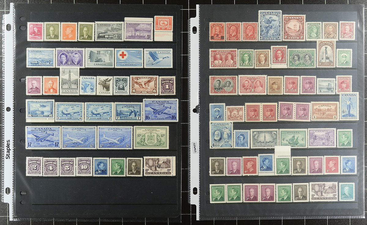 Mint Mish Mash. An intriguing and valuable holding of primarily QEII material (but noticed the odd earlier item). Arranged on 23 stockages, with emphasis on items that are "better than postage". Noted Centennials (including 2c precancel), Tagged issues, booklet panes, coils (including many strips), Cello Panes, plate blocks etc. A spot check showed primarily Never Hinged material, with everything here being overall very clean. Owner estimate the Unitrade catalogue is +/- $2000.00, which we think is fairly reasonable. Estimate =