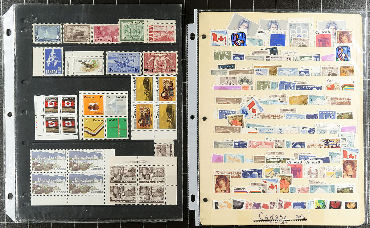 Mint Mish Mash. An intriguing and valuable holding of primarily QEII material (but noticed the odd earlier item). Arranged on 23 stockages, with emphasis on items that are "better than postage". Noted Centennials (including 2c precancel), Tagged issues, booklet panes, coils (including many strips), Cello Panes, plate blocks etc. A spot check showed primarily Never Hinged material, with everything here being overall very clean. Owner estimate the Unitrade catalogue is +/- $2000.00, which we think is fairly reasonable. Estimate =