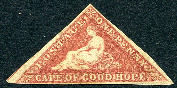 Fresh and F/VF mint no gum (traces of original gum) example of the 1857 issue 1p rose Cape Triangle, watermark 15, printed on white paper. 2025 Scott Classic US$850.00 =