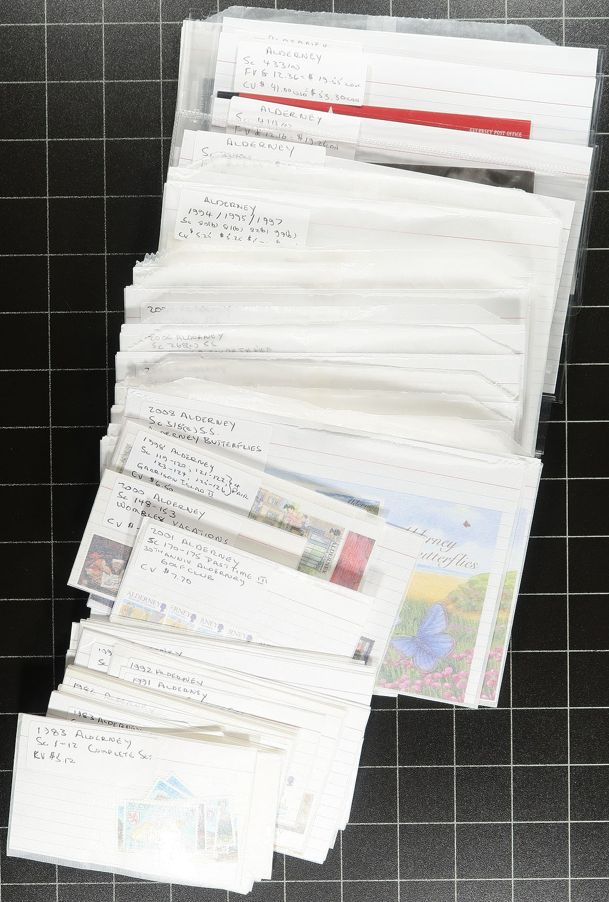 Lovely group of never hinged Alderney stamps, 1983-2014, with many hundreds of stamps in well described and organized glassines. The lot is generally organized by sets into individual glassines, each identified by Scott number along with older catalogue values, along with 14 complete booklets. Owner’s older Scott catalogue value for the group totals US$1,050.00. A nice lot for the Commonwealth collector. Estimate =