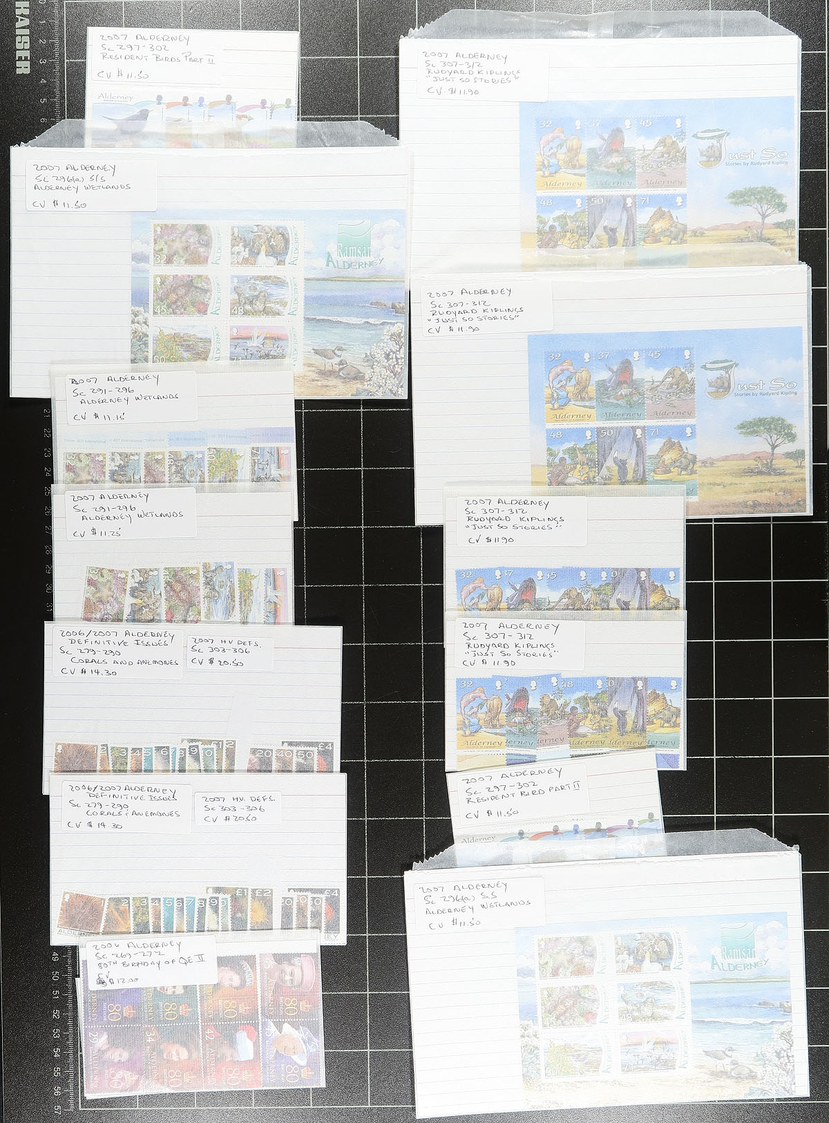 Lovely group of never hinged Alderney stamps, 1983-2014, with many hundreds of stamps in well described and organized glassines. The lot is generally organized by sets into individual glassines, each identified by Scott number along with older catalogue values, along with 14 complete booklets. Owner’s older Scott catalogue value for the group totals US$1,050.00. A nice lot for the Commonwealth collector. Estimate =