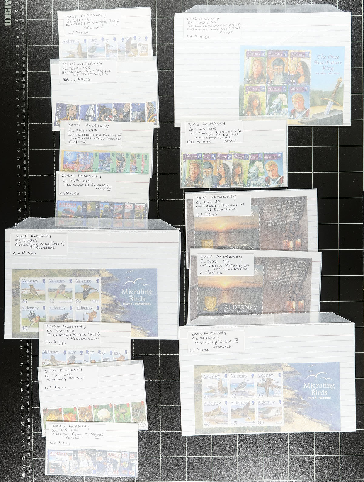 Lovely group of never hinged Alderney stamps, 1983-2014, with many hundreds of stamps in well described and organized glassines. The lot is generally organized by sets into individual glassines, each identified by Scott number along with older catalogue values, along with 14 complete booklets. Owner’s older Scott catalogue value for the group totals US$1,050.00. A nice lot for the Commonwealth collector. Estimate =
