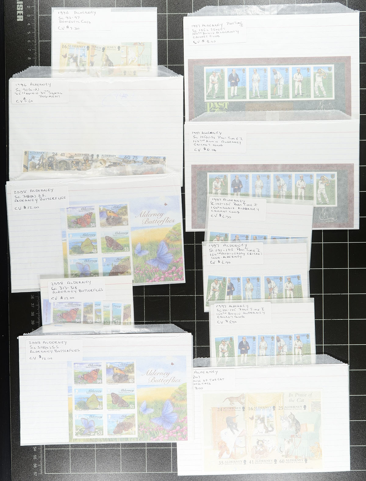 Lovely group of never hinged Alderney stamps, 1983-2014, with many hundreds of stamps in well described and organized glassines. The lot is generally organized by sets into individual glassines, each identified by Scott number along with older catalogue values, along with 14 complete booklets. Owner’s older Scott catalogue value for the group totals US$1,050.00. A nice lot for the Commonwealth collector. Estimate =