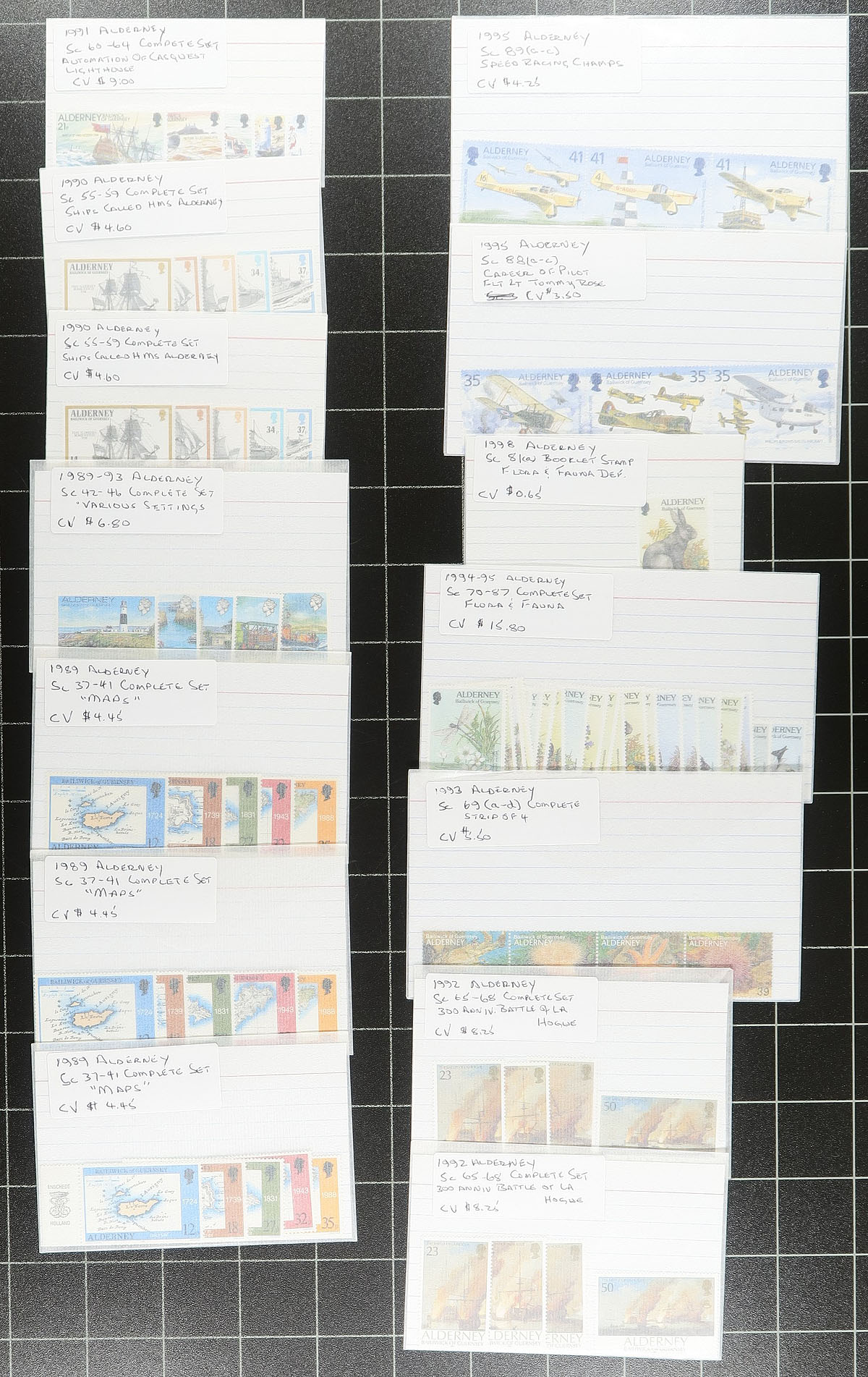 Lovely group of never hinged Alderney stamps, 1983-2014, with many hundreds of stamps in well described and organized glassines. The lot is generally organized by sets into individual glassines, each identified by Scott number along with older catalogue values, along with 14 complete booklets. Owner’s older Scott catalogue value for the group totals US$1,050.00. A nice lot for the Commonwealth collector. Estimate =