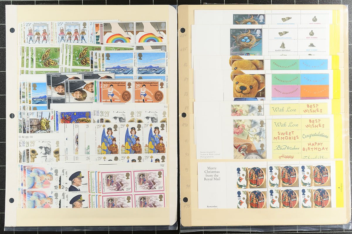 Accumulation of never hinged Great Britian stamps, 1980's-2001, containing many hundreds of stamps in over 15 stock or album pages. The lot generally consists of sets, gutter pairs (including traffic light pairs), a few blocks, and a few booklet panes. Owner’s 2019 Scott catalogue value for the lot totals US$662.00 ($893.70 CDN), with face value alone estimated at a couple hundred pounds (including a few 1ST stamps). A clean lot with a variety of purposes, overall very fine. Estimate =