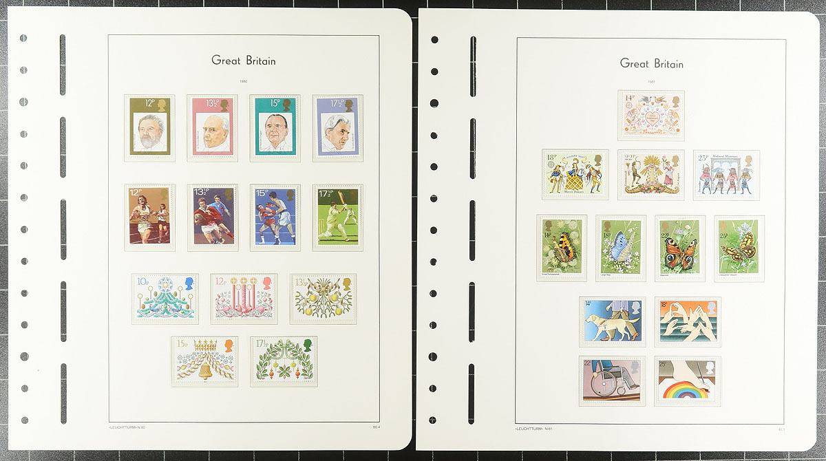 Accumulation of never hinged Great Britian stamps, 1980's-2001, containing many hundreds of stamps in over 15 stock or album pages. The lot generally consists of sets, gutter pairs (including traffic light pairs), a few blocks, and a few booklet panes. Owner’s 2019 Scott catalogue value for the lot totals US$662.00 ($893.70 CDN), with face value alone estimated at a couple hundred pounds (including a few 1ST stamps). A clean lot with a variety of purposes, overall very fine. Estimate =