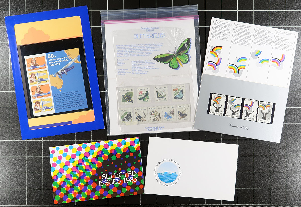 Group of roughly 45 Australia presentation and annual collections, 1970's-1980's, noting over 40 presentation packs with singles, sets, a few specimens from the 1970's-1980's, along with two still sealed annual collections from 2010 and 2012. Some mild duplication found within, still a nice clean lot with at least a few hundred dollars of face value material. Clean and very fine. Estimate =