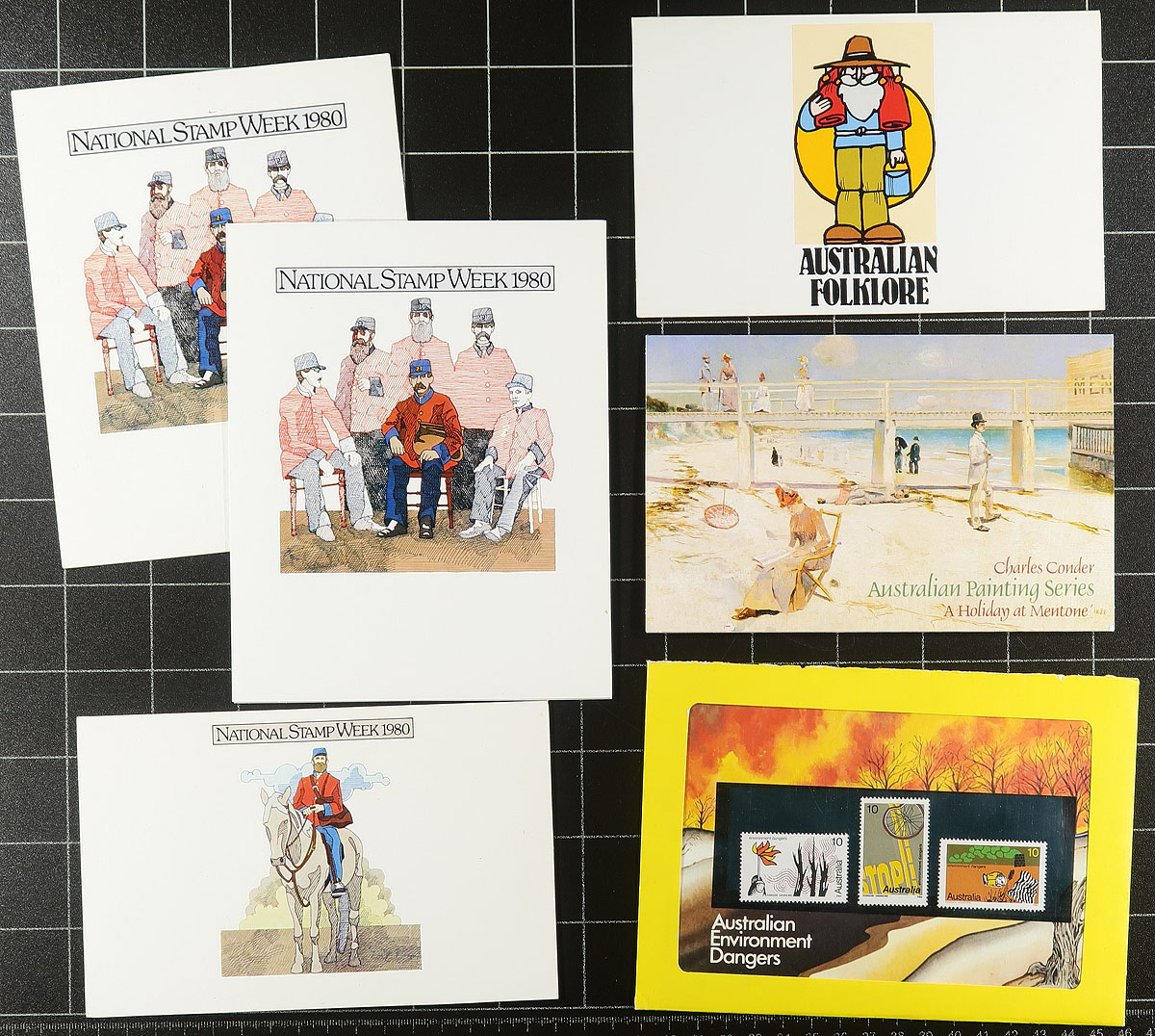 Group of roughly 45 Australia presentation and annual collections, 1970's-1980's, noting over 40 presentation packs with singles, sets, a few specimens from the 1970's-1980's, along with two still sealed annual collections from 2010 and 2012. Some mild duplication found within, still a nice clean lot with at least a few hundred dollars of face value material. Clean and very fine. Estimate =