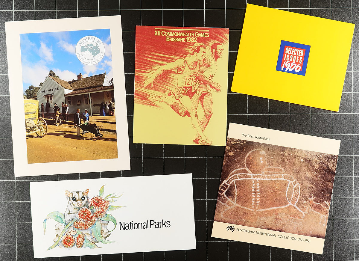 Group of roughly 45 Australia presentation and annual collections, 1970's-1980's, noting over 40 presentation packs with singles, sets, a few specimens from the 1970's-1980's, along with two still sealed annual collections from 2010 and 2012. Some mild duplication found within, still a nice clean lot with at least a few hundred dollars of face value material. Clean and very fine. Estimate =