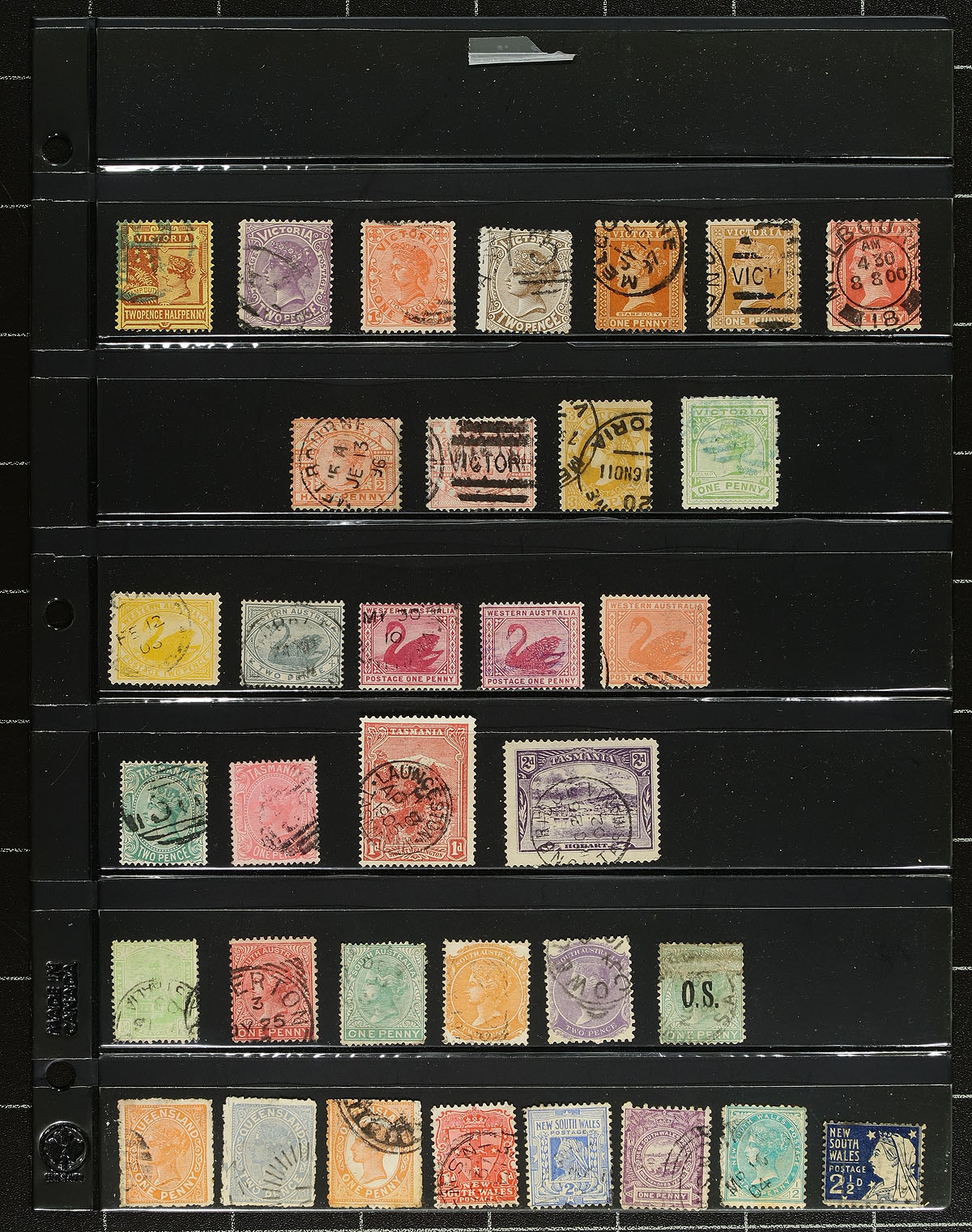 Collection / accumulation of used Australia, 1913-1990's, containing several hundreds of stamps in over 20 stock or album pages. We note selections of Kangaroos, KGV Heads, sets and partial sets, noting some material cataloguing $10 and up. Some mild duplication throughout, still al nice lot for the Australia or Commonwealth collector. Owner's older 2019 Scott US$1,837.00 =