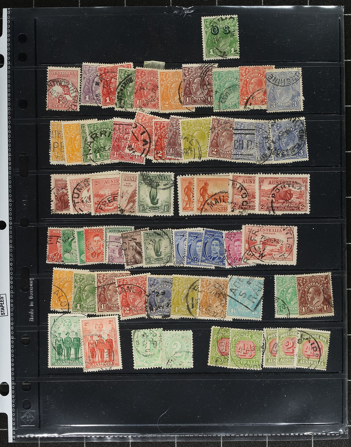 Collection / accumulation of used Australia, 1913-1990's, containing several hundreds of stamps in over 20 stock or album pages. We note selections of Kangaroos, KGV Heads, sets and partial sets, noting some material cataloguing $10 and up. Some mild duplication throughout, still al nice lot for the Australia or Commonwealth collector. Owner's older 2019 Scott US$1,837.00 =