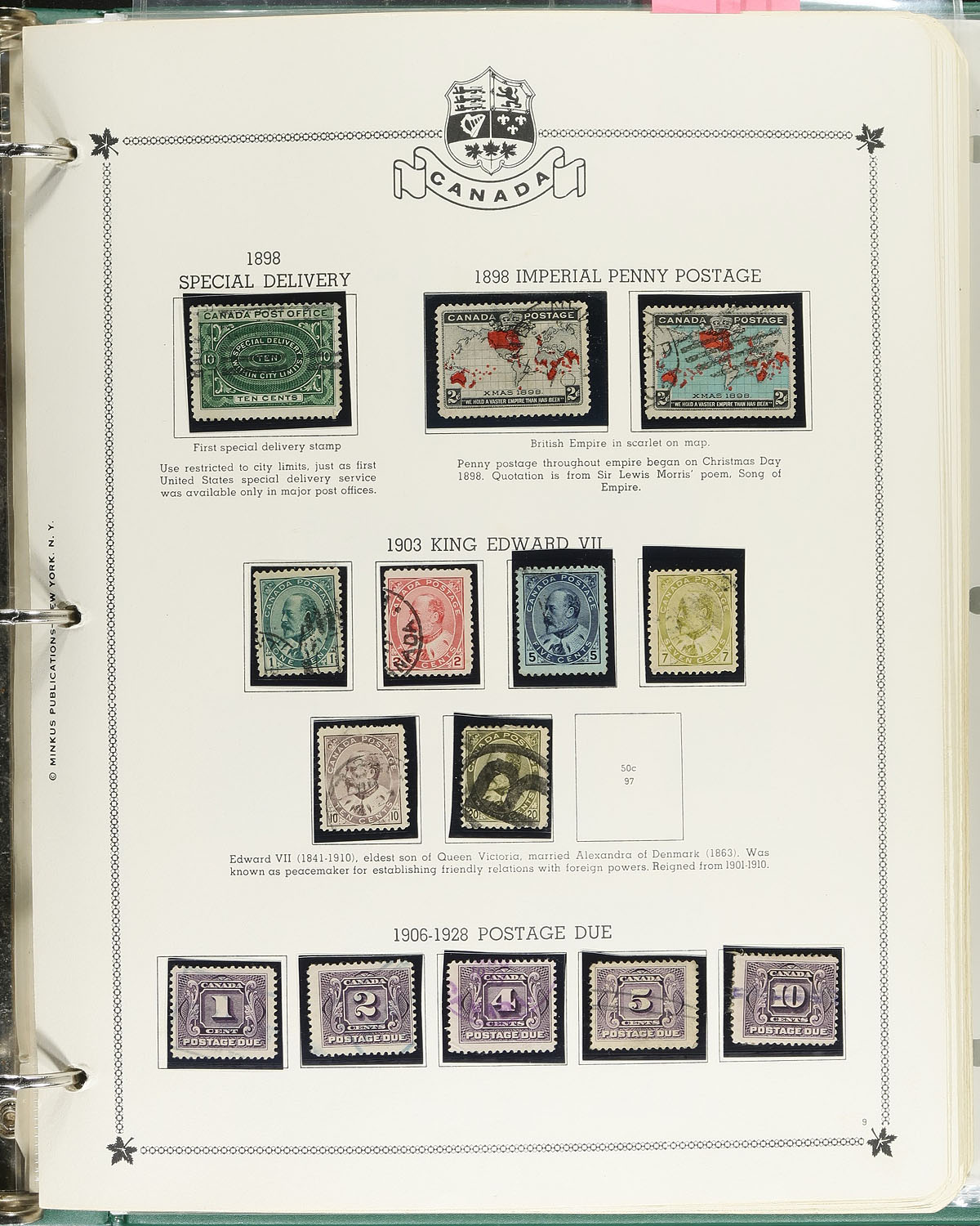 Nice collection of used Canada, 1870-1979, with many hundreds of stamps nicely organized in a Minkus album. The collection begins with a selection of 20 Small Queens, including 10c (x3), and 20c and 50c Widow Weeds, along with partial sets of Leafs, Numerals, Quebecs, Edwards, and continues with full sets of Admirals, Scrolls, Arch, up to the Peace issues. The collection also includes back of the book issues, a few covers, stamps on piece, and more. Postmark interest includes squared circles, cds, duplex, broken circles, including several "socked on the nose" town cancels. A nice collection for the used collector, a few faults to be expected, overall fine to very fine. Estimate =