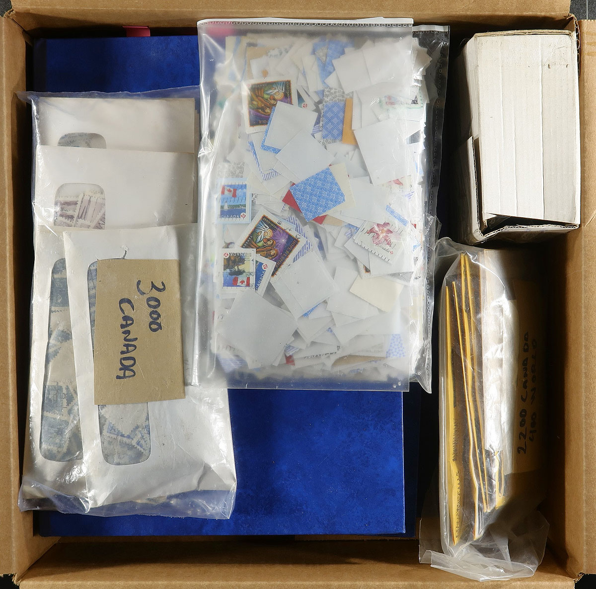 Good accumulation of used Canada, Small Queens to the 1990's, containing tens of thousands of stamps in three full stockbooks, plastic bags, envelopes, and more. The lot begins with selections of low denomination Small Queens, and continues with mostly definitive issues, including several high denomination $1 plus issues from the 1950's onwards. Postmark interest includes POCON types, cds, a few squared circles, and much more. A potentially high cataloguing lot, suitable for the used collector, overall fine to very fine. Estimate =