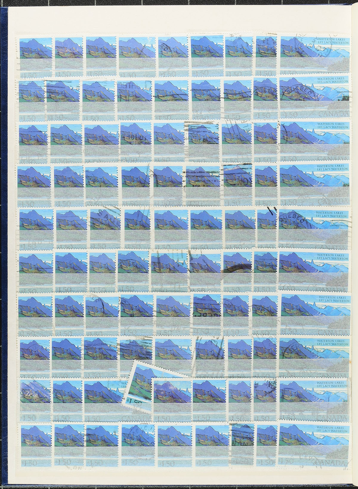 Good accumulation of used Canada, Small Queens to the 1990's, containing tens of thousands of stamps in three full stockbooks, plastic bags, envelopes, and more. The lot begins with selections of low denomination Small Queens, and continues with mostly definitive issues, including several high denomination $1 plus issues from the 1950's onwards. Postmark interest includes POCON types, cds, a few squared circles, and much more. A potentially high cataloguing lot, suitable for the used collector, overall fine to very fine. Estimate =