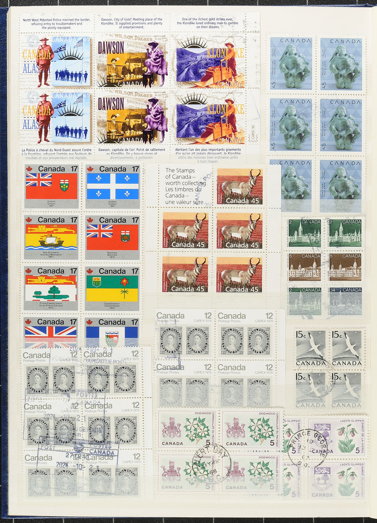 Good accumulation of used Canada, Small Queens to the 1990's, containing tens of thousands of stamps in three full stockbooks, plastic bags, envelopes, and more. The lot begins with selections of low denomination Small Queens, and continues with mostly definitive issues, including several high denomination $1 plus issues from the 1950's onwards. Postmark interest includes POCON types, cds, a few squared circles, and much more. A potentially high cataloguing lot, suitable for the used collector, overall fine to very fine. Estimate =