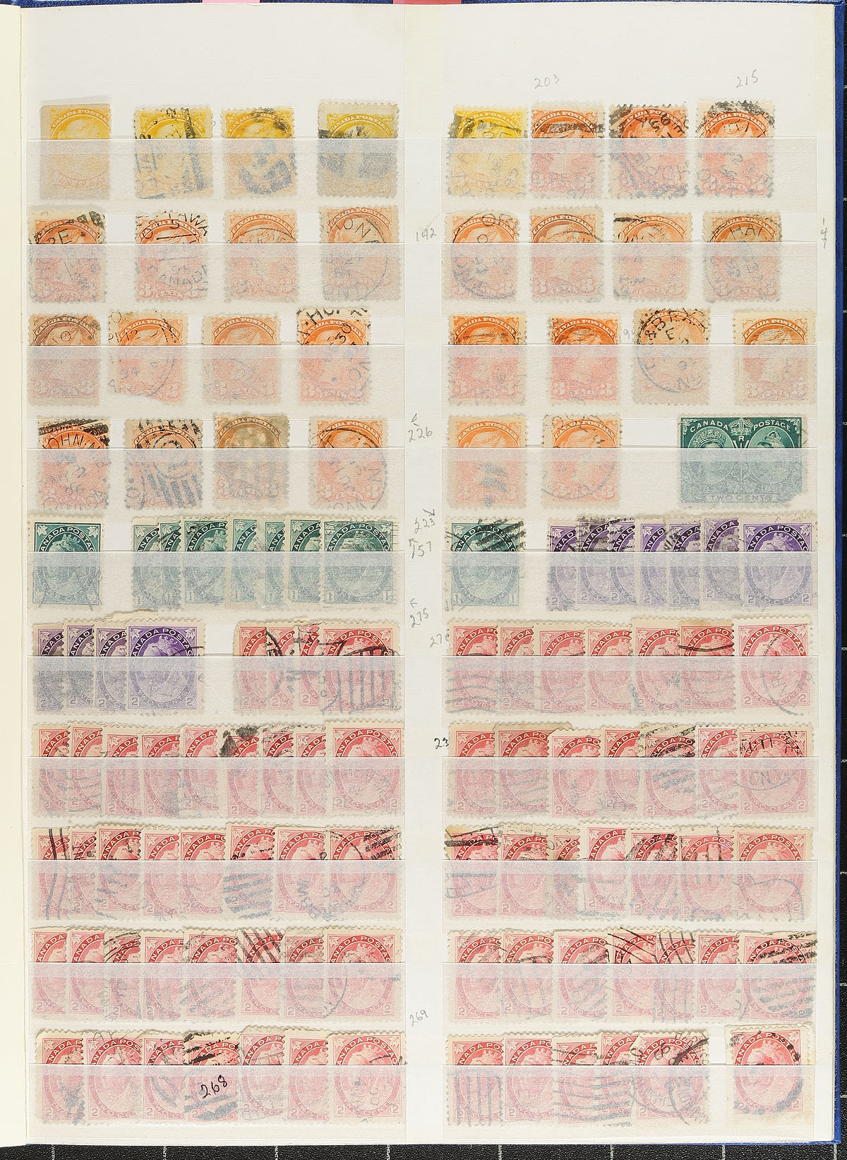 Good accumulation of used Canada, Small Queens to the 1990's, containing tens of thousands of stamps in three full stockbooks, plastic bags, envelopes, and more. The lot begins with selections of low denomination Small Queens, and continues with mostly definitive issues, including several high denomination $1 plus issues from the 1950's onwards. Postmark interest includes POCON types, cds, a few squared circles, and much more. A potentially high cataloguing lot, suitable for the used collector, overall fine to very fine. Estimate =
