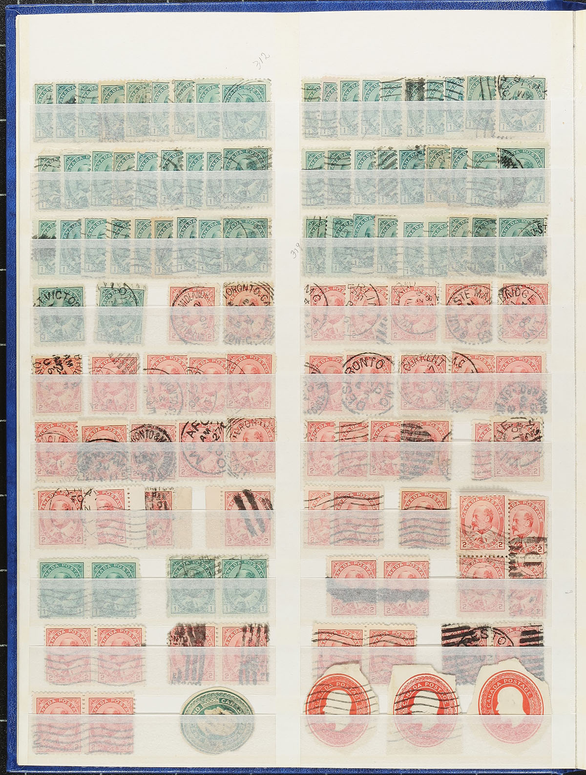 Good accumulation of used Canada, Small Queens to the 1990's, containing tens of thousands of stamps in three full stockbooks, plastic bags, envelopes, and more. The lot begins with selections of low denomination Small Queens, and continues with mostly definitive issues, including several high denomination $1 plus issues from the 1950's onwards. Postmark interest includes POCON types, cds, a few squared circles, and much more. A potentially high cataloguing lot, suitable for the used collector, overall fine to very fine. Estimate =