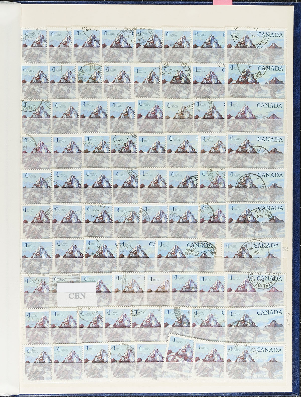 Good accumulation of used Canada, Small Queens to the 1990's, containing tens of thousands of stamps in three full stockbooks, plastic bags, envelopes, and more. The lot begins with selections of low denomination Small Queens, and continues with mostly definitive issues, including several high denomination $1 plus issues from the 1950's onwards. Postmark interest includes POCON types, cds, a few squared circles, and much more. A potentially high cataloguing lot, suitable for the used collector, overall fine to very fine. Estimate =