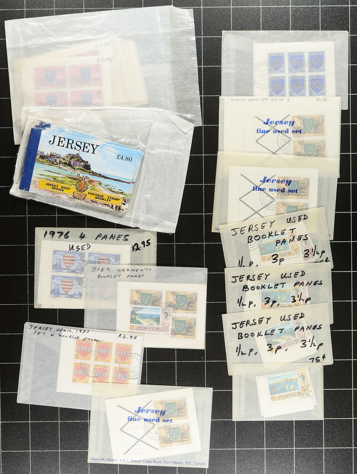 Nice accumulation of Jersey used booklets, booklet panes and souvenir sheets, 1969-1999, all identified in several glassines. The material appears to range from Scott #16/375, noting over 50 booklets, 50 sheets, and a few hundred booklet panes, all the stamps having CTO cancels. Owner’s older Stanley Gibbons catalogue value for the group totals £1,512.00. Some duplication to be expected, a nice lot for collectors and dealers alike. Estimate =