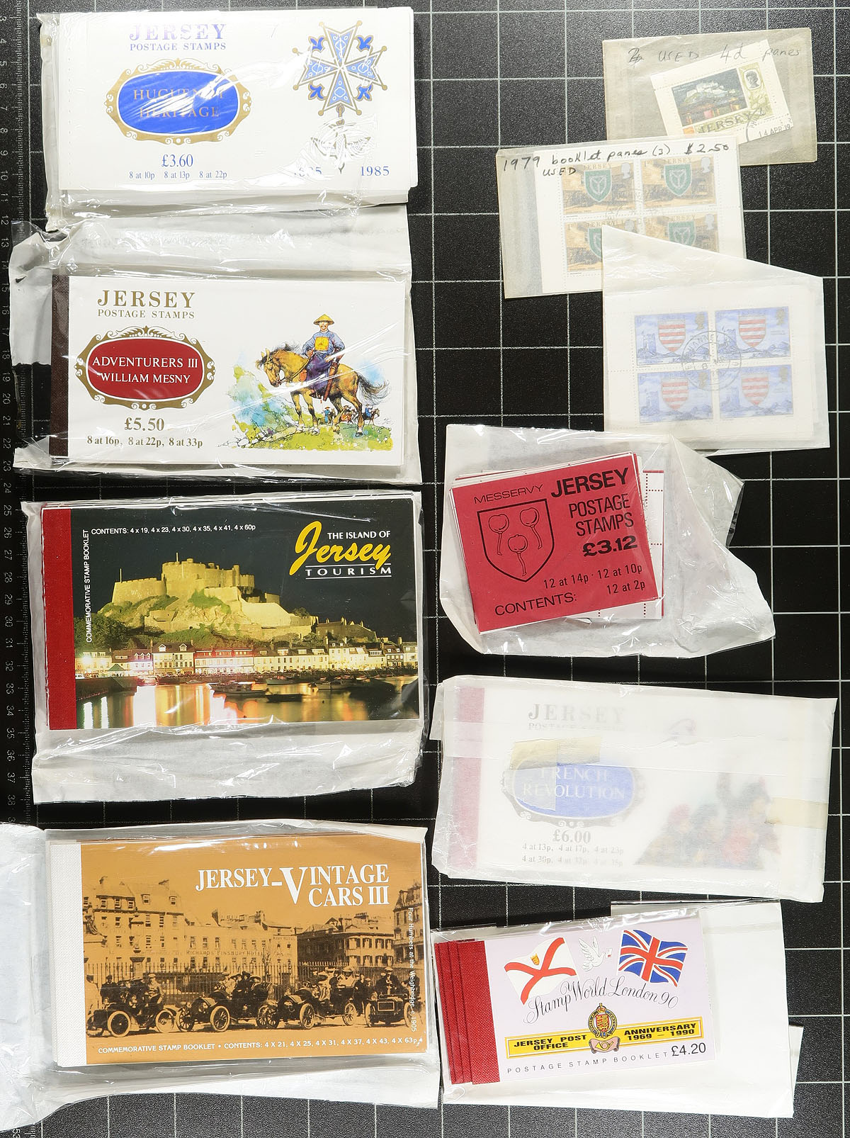 Nice accumulation of Jersey used booklets, booklet panes and souvenir sheets, 1969-1999, all identified in several glassines. The material appears to range from Scott #16/375, noting over 50 booklets, 50 sheets, and a few hundred booklet panes, all the stamps having CTO cancels. Owner’s older Stanley Gibbons catalogue value for the group totals £1,512.00. Some duplication to be expected, a nice lot for collectors and dealers alike. Estimate =