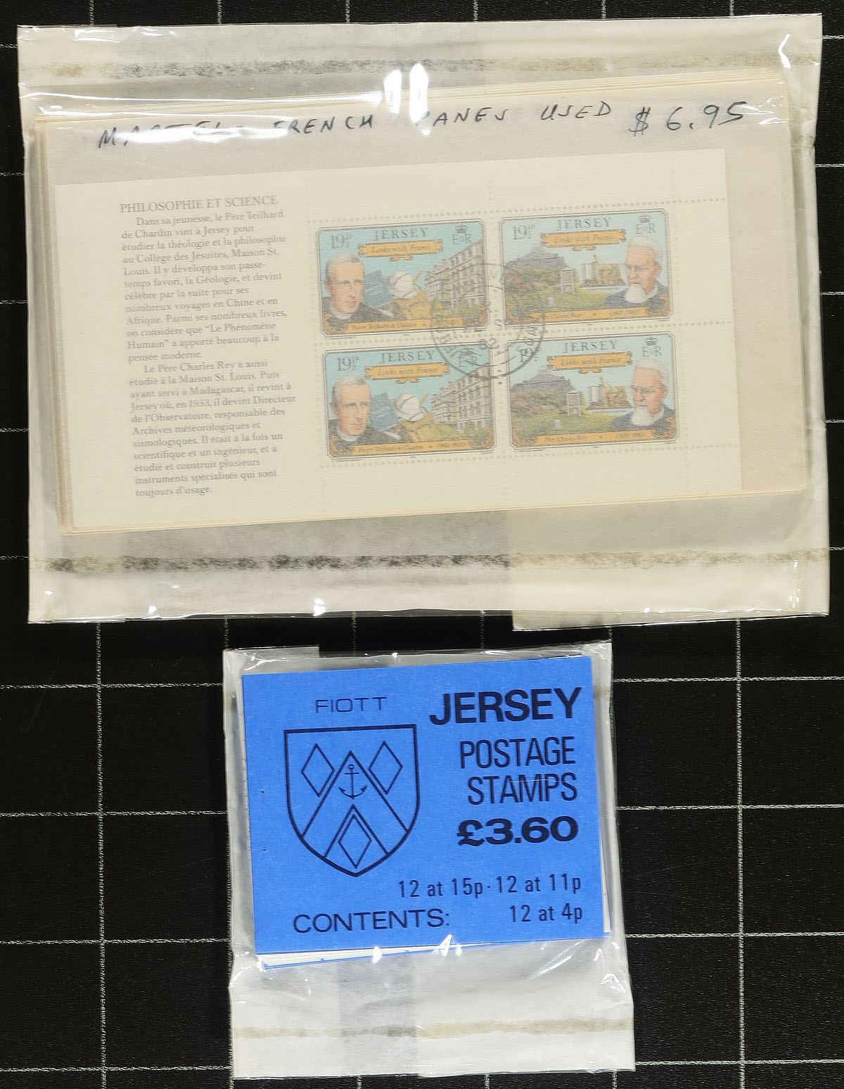 Nice accumulation of Jersey used booklets, booklet panes and souvenir sheets, 1969-1999, all identified in several glassines. The material appears to range from Scott #16/375, noting over 50 booklets, 50 sheets, and a few hundred booklet panes, all the stamps having CTO cancels. Owner’s older Stanley Gibbons catalogue value for the group totals £1,512.00. Some duplication to be expected, a nice lot for collectors and dealers alike. Estimate =