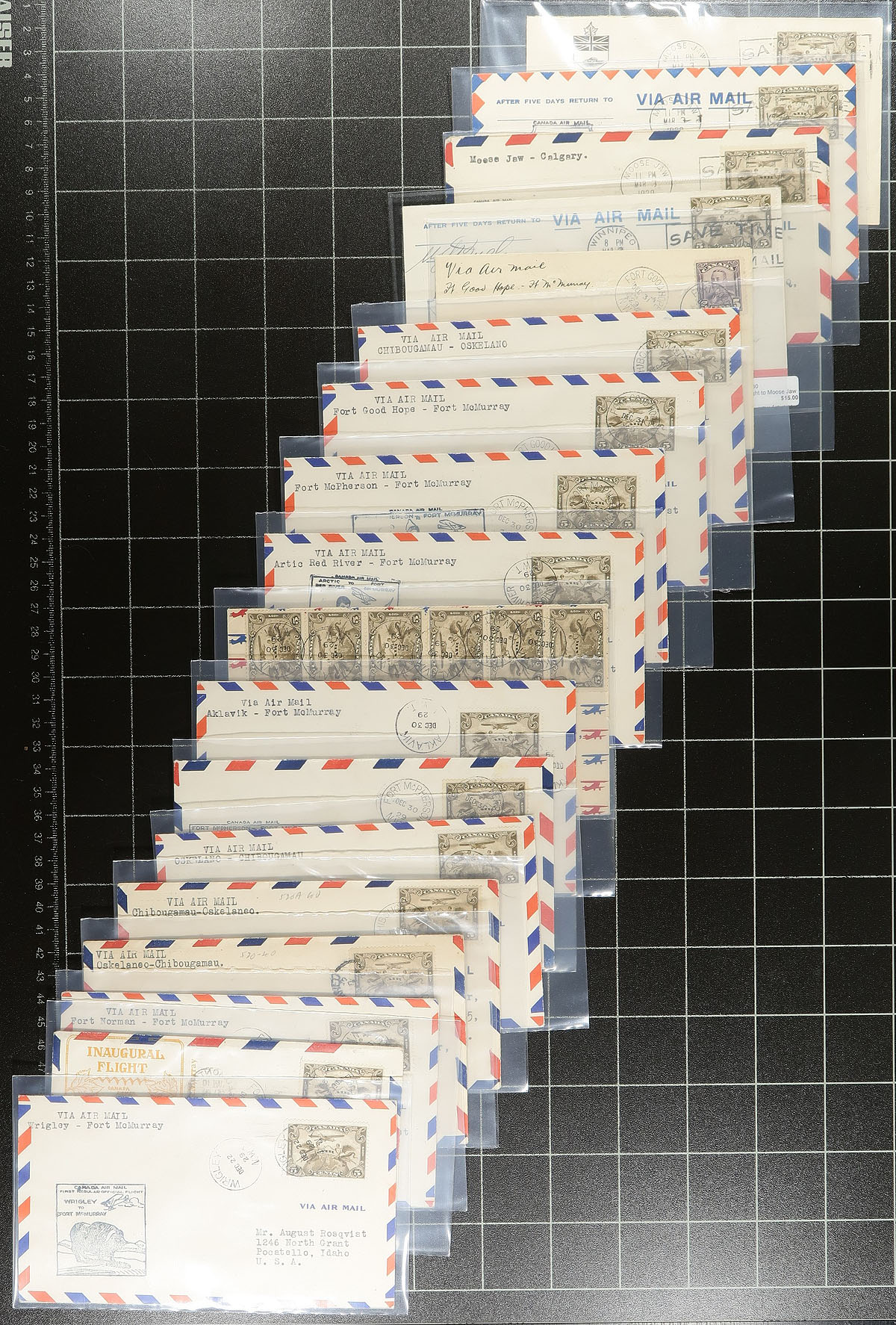 Lifetime Airmail First Flight Cover Collection. A seldom seen lifetime collection of over 500 Canadian First Flight Covers 1927-1949, all individually sleeved and arranged chronologically within a clear plastic bin. Many better noted, with individual items priced up to $50.00 (still in the original dealer sleeve from when purchased). While there might be a bit of minor duplication, the majority here will be different legs / routes etc, from across the country. Of particular note is the array of stamp frankings, both airmail and regular issues. The nicest airmail group we have offered in several years. Well worth the reasonable estimate. Estimate =