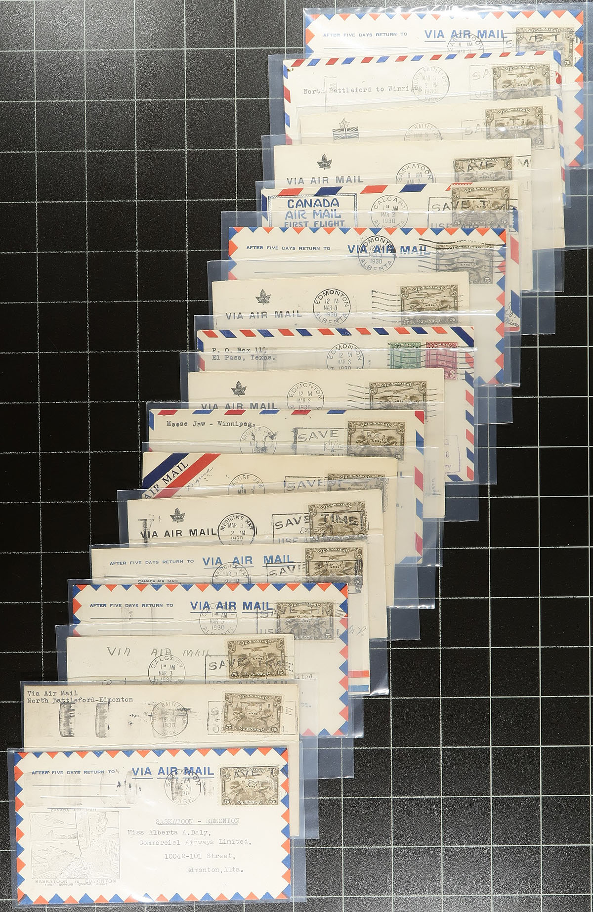 Lifetime Airmail First Flight Cover Collection. A seldom seen lifetime collection of over 500 Canadian First Flight Covers 1927-1949, all individually sleeved and arranged chronologically within a clear plastic bin. Many better noted, with individual items priced up to $50.00 (still in the original dealer sleeve from when purchased). While there might be a bit of minor duplication, the majority here will be different legs / routes etc, from across the country. Of particular note is the array of stamp frankings, both airmail and regular issues. The nicest airmail group we have offered in several years. Well worth the reasonable estimate. Estimate =