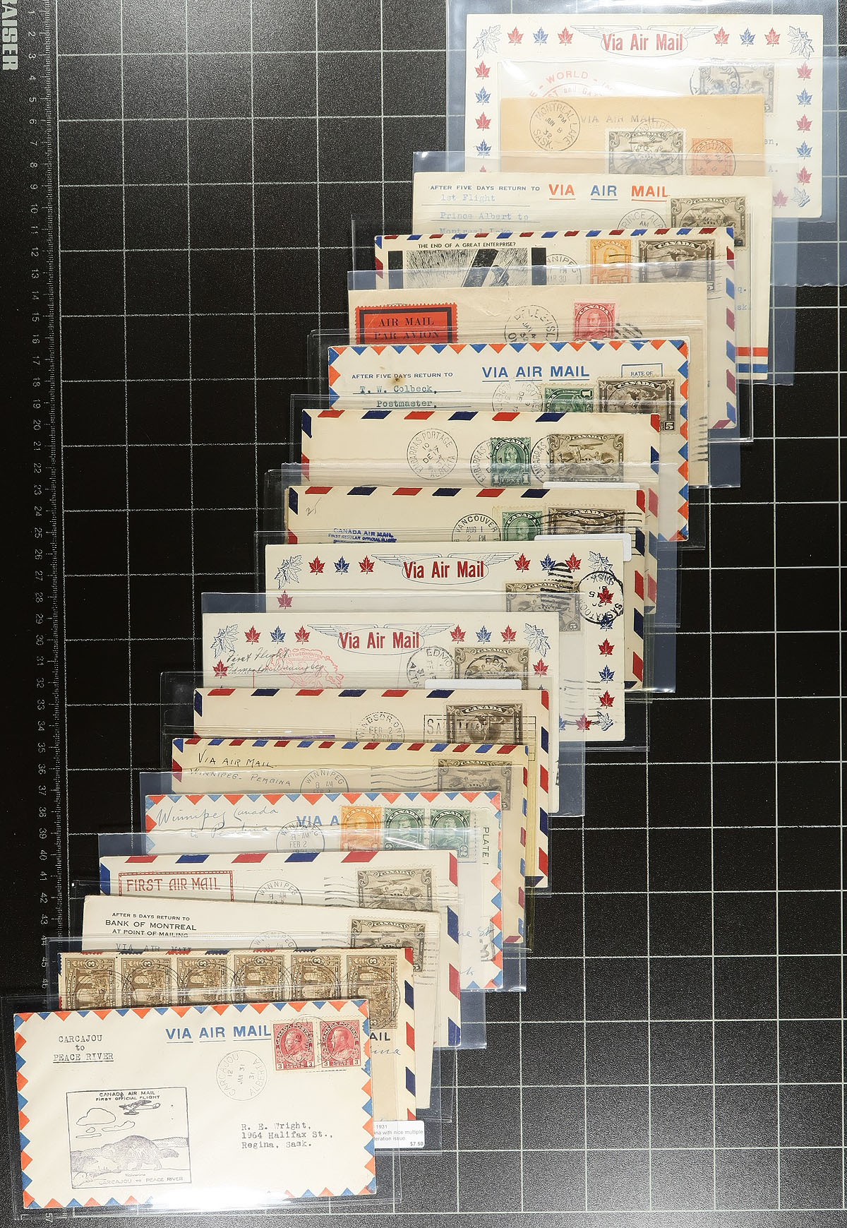 Lifetime Airmail First Flight Cover Collection. A seldom seen lifetime collection of over 500 Canadian First Flight Covers 1927-1949, all individually sleeved and arranged chronologically within a clear plastic bin. Many better noted, with individual items priced up to $50.00 (still in the original dealer sleeve from when purchased). While there might be a bit of minor duplication, the majority here will be different legs / routes etc, from across the country. Of particular note is the array of stamp frankings, both airmail and regular issues. The nicest airmail group we have offered in several years. Well worth the reasonable estimate. Estimate =