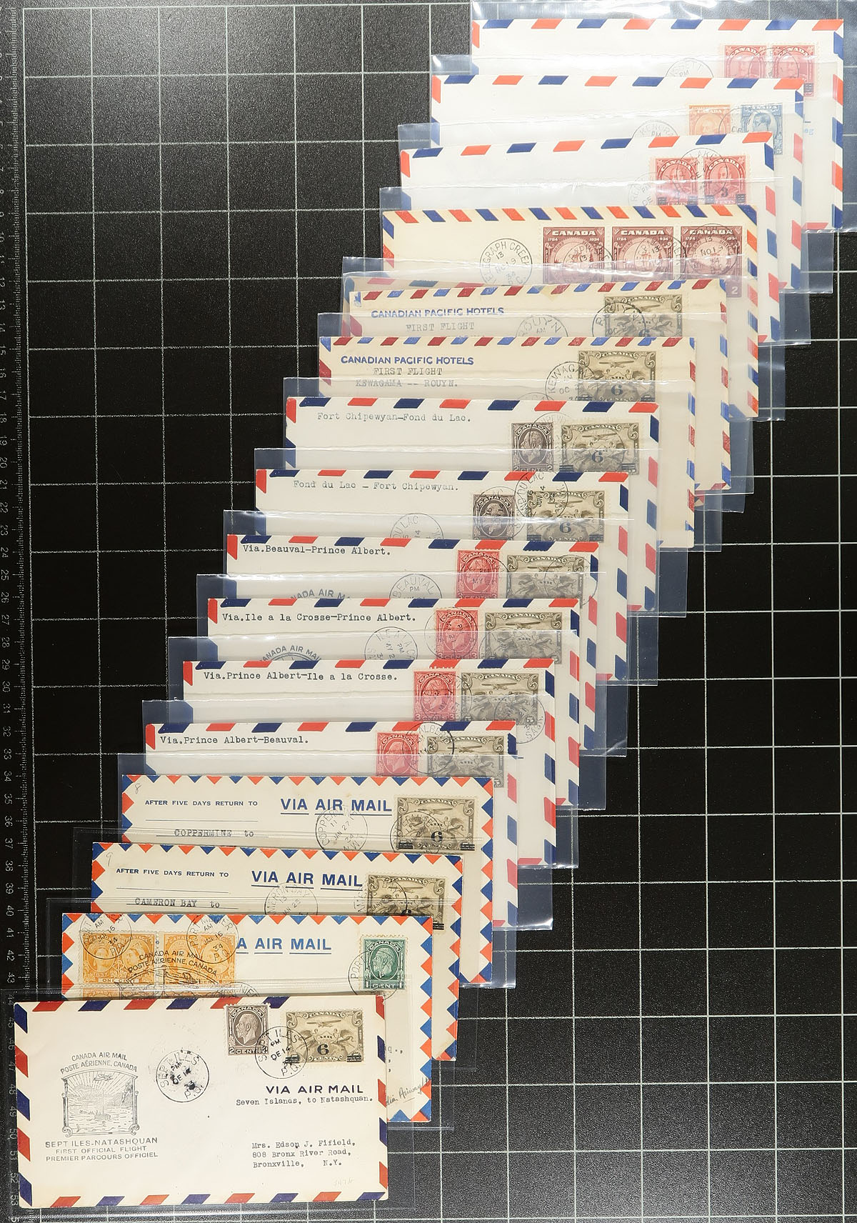 Lifetime Airmail First Flight Cover Collection. A seldom seen lifetime collection of over 500 Canadian First Flight Covers 1927-1949, all individually sleeved and arranged chronologically within a clear plastic bin. Many better noted, with individual items priced up to $50.00 (still in the original dealer sleeve from when purchased). While there might be a bit of minor duplication, the majority here will be different legs / routes etc, from across the country. Of particular note is the array of stamp frankings, both airmail and regular issues. The nicest airmail group we have offered in several years. Well worth the reasonable estimate. Estimate =