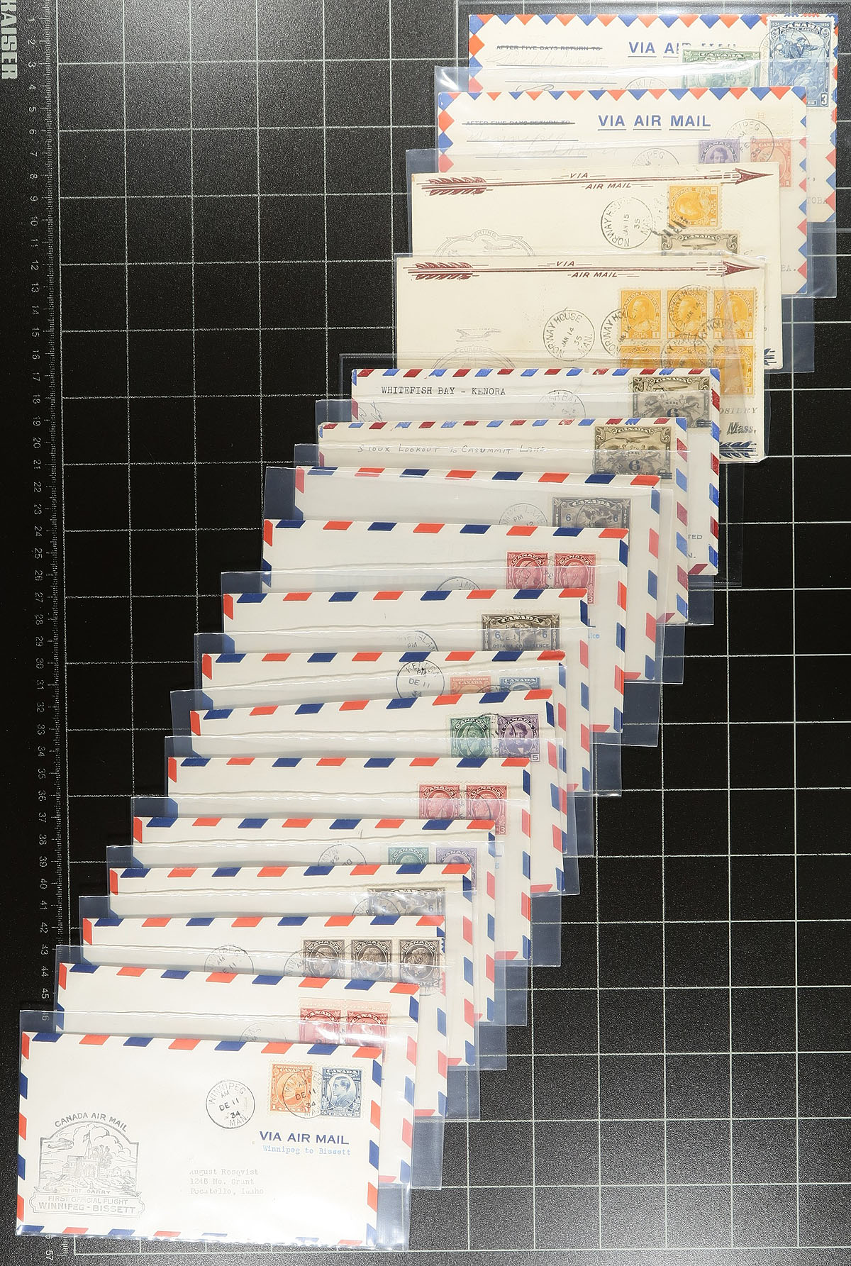 Lifetime Airmail First Flight Cover Collection. A seldom seen lifetime collection of over 500 Canadian First Flight Covers 1927-1949, all individually sleeved and arranged chronologically within a clear plastic bin. Many better noted, with individual items priced up to $50.00 (still in the original dealer sleeve from when purchased). While there might be a bit of minor duplication, the majority here will be different legs / routes etc, from across the country. Of particular note is the array of stamp frankings, both airmail and regular issues. The nicest airmail group we have offered in several years. Well worth the reasonable estimate. Estimate =
