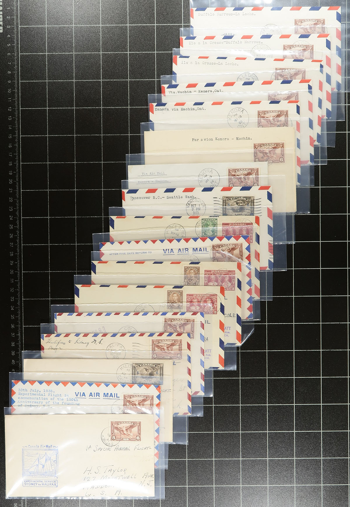 Lifetime Airmail First Flight Cover Collection. A seldom seen lifetime collection of over 500 Canadian First Flight Covers 1927-1949, all individually sleeved and arranged chronologically within a clear plastic bin. Many better noted, with individual items priced up to $50.00 (still in the original dealer sleeve from when purchased). While there might be a bit of minor duplication, the majority here will be different legs / routes etc, from across the country. Of particular note is the array of stamp frankings, both airmail and regular issues. The nicest airmail group we have offered in several years. Well worth the reasonable estimate. Estimate =