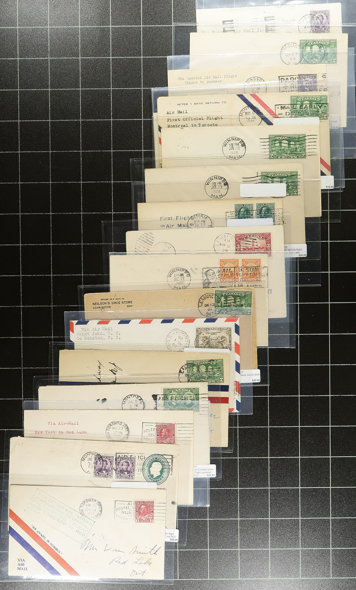 Lifetime Airmail First Flight Cover Collection. A seldom seen lifetime collection of over 500 Canadian First Flight Covers 1927-1949, all individually sleeved and arranged chronologically within a clear plastic bin. Many better noted, with individual items priced up to $50.00 (still in the original dealer sleeve from when purchased). While there might be a bit of minor duplication, the majority here will be different legs / routes etc, from across the country. Of particular note is the array of stamp frankings, both airmail and regular issues. The nicest airmail group we have offered in several years. Well worth the reasonable estimate. Estimate =