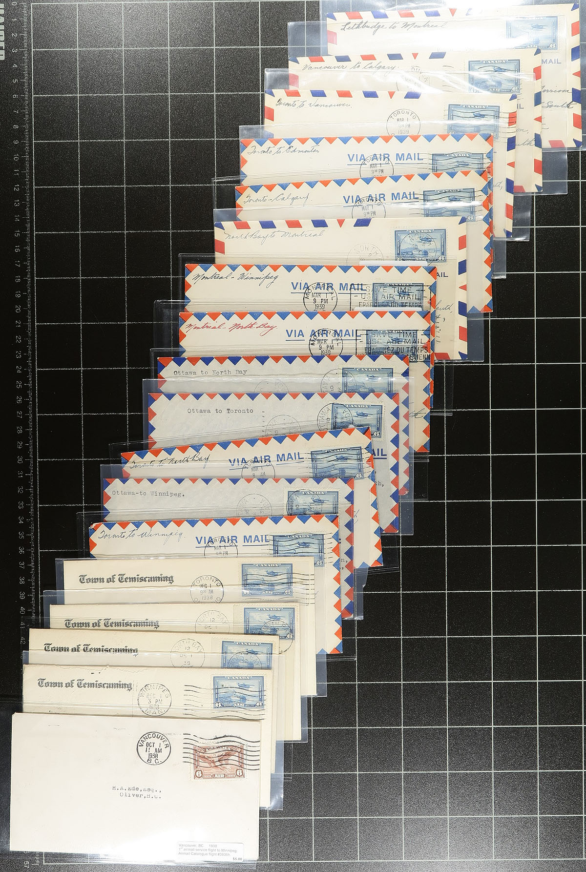 Lifetime Airmail First Flight Cover Collection. A seldom seen lifetime collection of over 500 Canadian First Flight Covers 1927-1949, all individually sleeved and arranged chronologically within a clear plastic bin. Many better noted, with individual items priced up to $50.00 (still in the original dealer sleeve from when purchased). While there might be a bit of minor duplication, the majority here will be different legs / routes etc, from across the country. Of particular note is the array of stamp frankings, both airmail and regular issues. The nicest airmail group we have offered in several years. Well worth the reasonable estimate. Estimate =