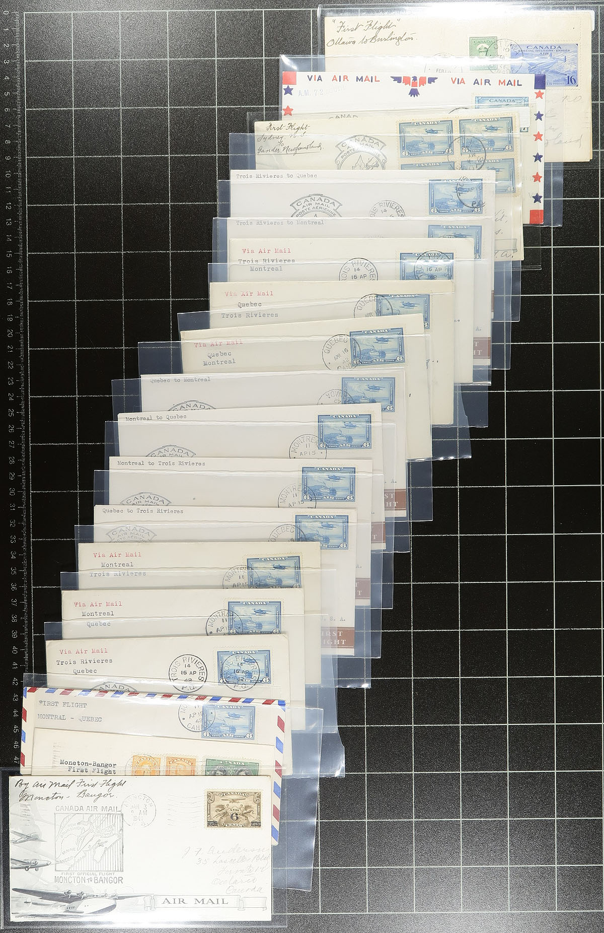 Lifetime Airmail First Flight Cover Collection. A seldom seen lifetime collection of over 500 Canadian First Flight Covers 1927-1949, all individually sleeved and arranged chronologically within a clear plastic bin. Many better noted, with individual items priced up to $50.00 (still in the original dealer sleeve from when purchased). While there might be a bit of minor duplication, the majority here will be different legs / routes etc, from across the country. Of particular note is the array of stamp frankings, both airmail and regular issues. The nicest airmail group we have offered in several years. Well worth the reasonable estimate. Estimate =