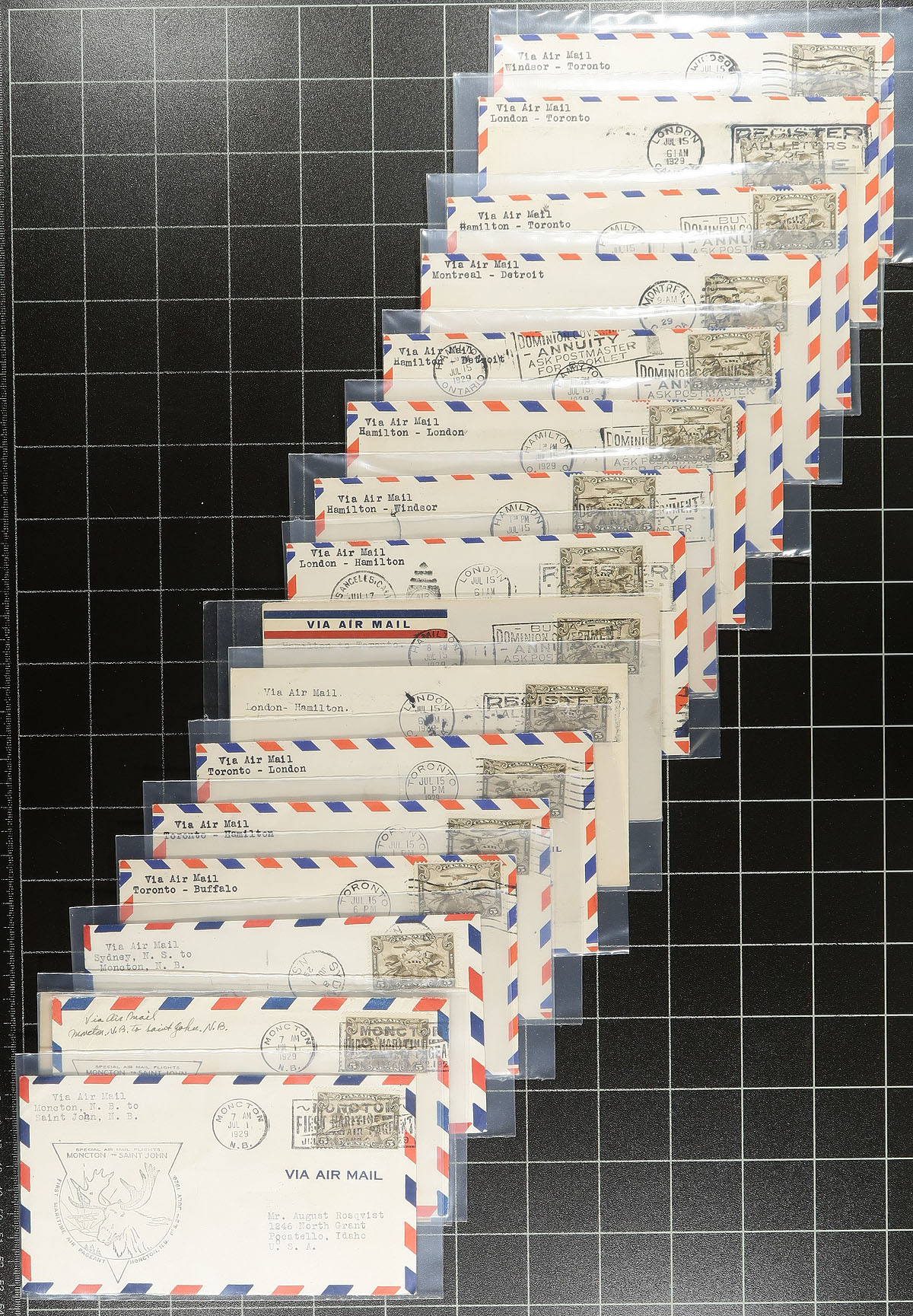Lifetime Airmail First Flight Cover Collection. A seldom seen lifetime collection of over 500 Canadian First Flight Covers 1927-1949, all individually sleeved and arranged chronologically within a clear plastic bin. Many better noted, with individual items priced up to $50.00 (still in the original dealer sleeve from when purchased). While there might be a bit of minor duplication, the majority here will be different legs / routes etc, from across the country. Of particular note is the array of stamp frankings, both airmail and regular issues. The nicest airmail group we have offered in several years. Well worth the reasonable estimate. Estimate =