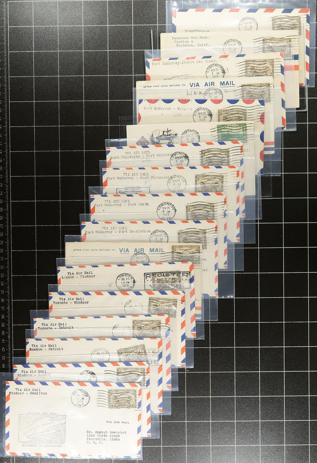 Lifetime Airmail First Flight Cover Collection. A seldom seen lifetime collection of over 500 Canadian First Flight Covers 1927-1949, all individually sleeved and arranged chronologically within a clear plastic bin. Many better noted, with individual items priced up to $50.00 (still in the original dealer sleeve from when purchased). While there might be a bit of minor duplication, the majority here will be different legs / routes etc, from across the country. Of particular note is the array of stamp frankings, both airmail and regular issues. The nicest airmail group we have offered in several years. Well worth the reasonable estimate. Estimate =
