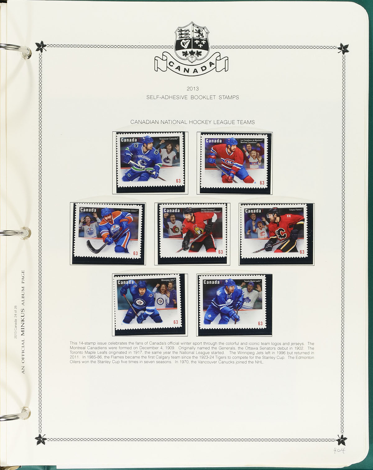 Minkus Mint Collection Part E. The run of 2010-2014, housed within a deluxe padded / illustrated green 3-ring album, with matching Minkus pages for 2010-2014 and black mounts added for the stamps. This album sees the transition into the "P" stamp, with the majority of issues being permanent values with singles all looking to be "die-cuts" from Quarterly or Annual collections. Also noted better issues such as Beneficial Insects and $10.0 Whale. Conservatively valued for the total mint postage / face value alone. Total face value =