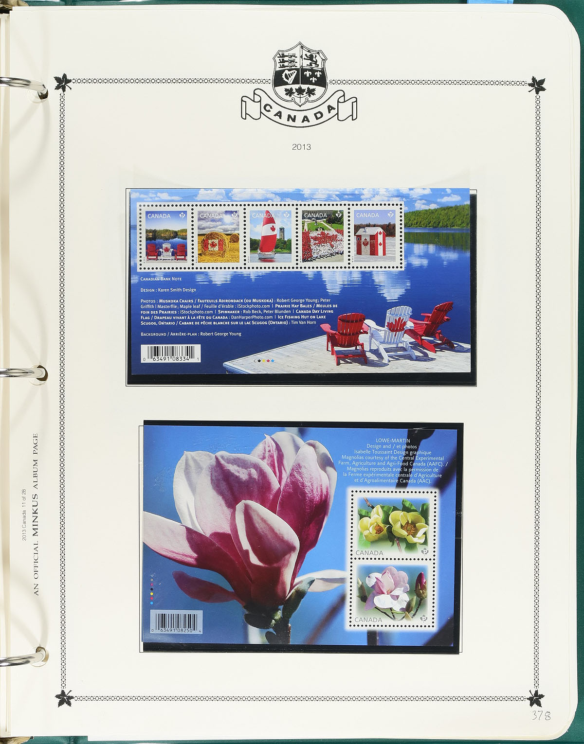 Minkus Mint Collection Part E. The run of 2010-2014, housed within a deluxe padded / illustrated green 3-ring album, with matching Minkus pages for 2010-2014 and black mounts added for the stamps. This album sees the transition into the "P" stamp, with the majority of issues being permanent values with singles all looking to be "die-cuts" from Quarterly or Annual collections. Also noted better issues such as Beneficial Insects and $10.0 Whale. Conservatively valued for the total mint postage / face value alone. Total face value =