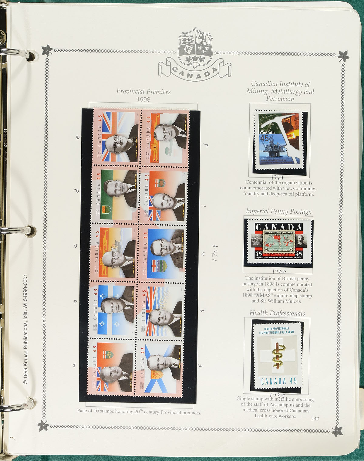 Minkus Mint Collection Part B. The run of 1986-1999, housed within a deluxe padded / illustrated green 3-ring album, with matching Minkus pages for 1986-1999 and black mounts added for the stamps. This album is a largely complete for the period, with the many large commemorative issues from this period. We also noted a run of Canadian Wildlife Conservation booklets, which were note counted in the total face value. Conservatively valued for the total mint postage / face value alone. Total face value =