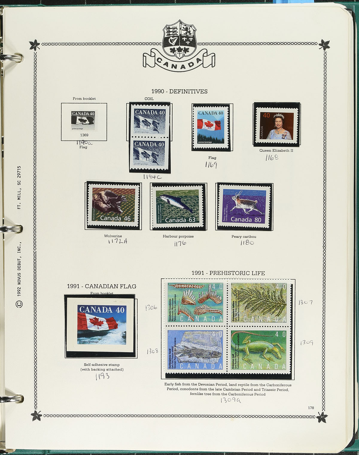 Minkus Mint Collection Part B. The run of 1986-1999, housed within a deluxe padded / illustrated green 3-ring album, with matching Minkus pages for 1986-1999 and black mounts added for the stamps. This album is a largely complete for the period, with the many large commemorative issues from this period. We also noted a run of Canadian Wildlife Conservation booklets, which were note counted in the total face value. Conservatively valued for the total mint postage / face value alone. Total face value =