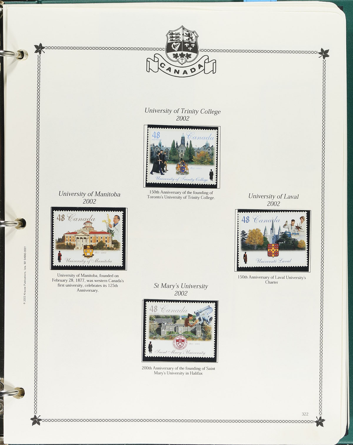 Minkus Mint Collection Part C. The run of 2000-2004, housed within a deluxe padded / illustrated green 3-ring album, with matching Minkus pages for 2000-2004 and black mounts added for the stamps. This album is a largely complete for the period, with the many large commemorative issues / self adhesives / panes etc (including the better 2003 Hockey booklet pane). Conservatively valued for the total mint postage / face value alone. Total face value =