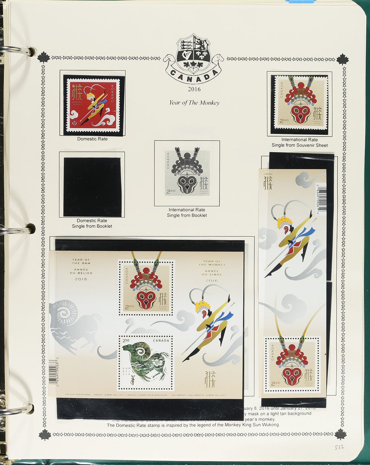Minkus Mint Collection Part F. The run of 2015-2017, housed within a deluxe padded / illustrated green 3-ring album, with matching Minkus pages for 2015-2017 and black mounts added for the stamps. Lots of better issues here, including "dollar plus" values, souvenir sheets and many "die cut" issues. Also included are the pages for "Provinces", but only a smattering of stamps were seen here. Conservatively valued for the total mint postage / face value alone. Total face value =