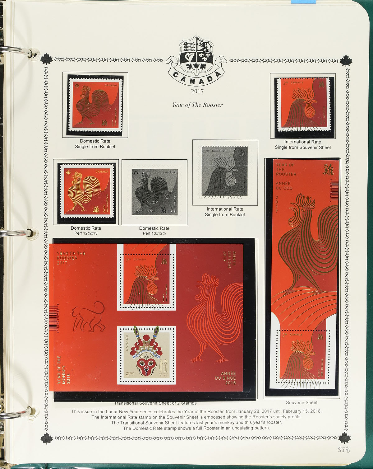 Minkus Mint Collection Part F. The run of 2015-2017, housed within a deluxe padded / illustrated green 3-ring album, with matching Minkus pages for 2015-2017 and black mounts added for the stamps. Lots of better issues here, including "dollar plus" values, souvenir sheets and many "die cut" issues. Also included are the pages for "Provinces", but only a smattering of stamps were seen here. Conservatively valued for the total mint postage / face value alone. Total face value =