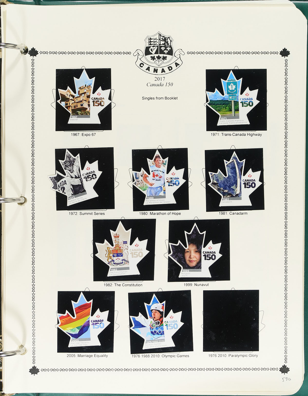 Minkus Mint Collection Part F. The run of 2015-2017, housed within a deluxe padded / illustrated green 3-ring album, with matching Minkus pages for 2015-2017 and black mounts added for the stamps. Lots of better issues here, including "dollar plus" values, souvenir sheets and many "die cut" issues. Also included are the pages for "Provinces", but only a smattering of stamps were seen here. Conservatively valued for the total mint postage / face value alone. Total face value =