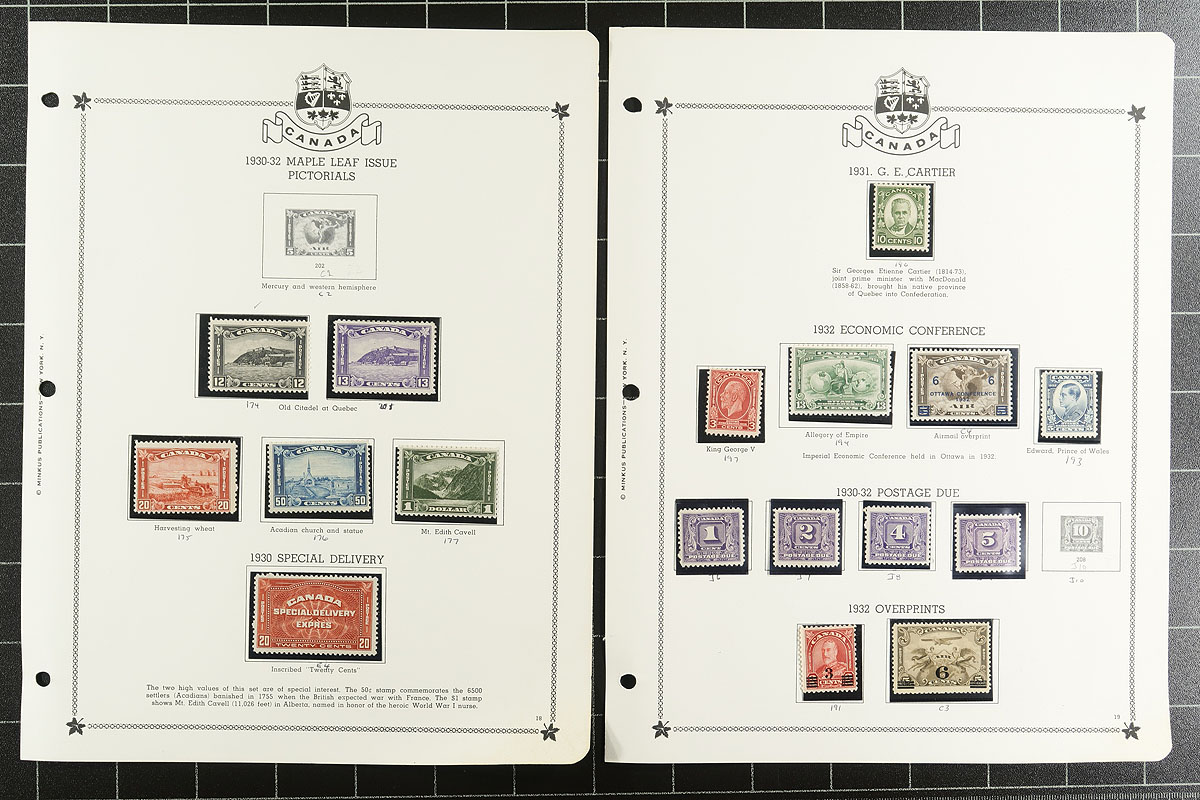 Minkus Mint Collection Part A. The run of 1859-1985, housed within a deluxe padded / illustrated green 3-ring album, with matching Minkus pages going back to 1851 and black mounts added for the stamps. Loads of value here, with primarily used earlier issues including Cents, Large Queens, Small Queens, Maps, Leafs, Numerals, Edwards, Tercentenary, Admiral and strong George V era. A bit mixed condition on the earlier material, but lots of better stamps here, expect the mint to be Hinged / Hinge Remnant, but with some Never Hinged mixed in to act as a bonus once discovered. Includes "back of the book" for the period as well. The catalogue value would likely easily encroach on $8,000-$10,000. Offered intact from a local estate. Estimate =